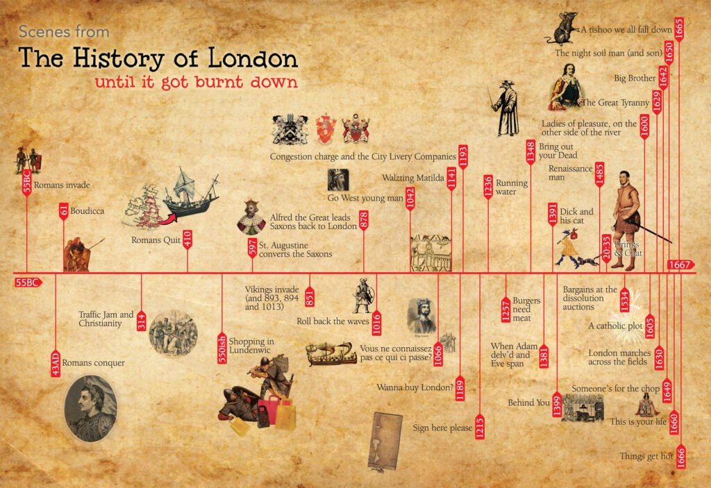 In 55 BC Julius Caesar came here and said Veni, vidi, vici. But he didn’t, he went back to fight the Gallic wars. The Romans were back to stay in 43 AD, the Saxons came to shop and the Vikings to pillage. A thousand years ago Edward the Confessor wanted to go on a pilgrimage to St. Peter’s in Rome. His courtiers told him this would take a long time. They suggested he build a church dedicated to St. Peter here. It was very crowded inside the walls of the City so Edward built his abbey to the west and he called it ‘the church to the West’. He moved there, built himself a palace and London became two cities. When he died William of Normandy arrived at the gates so we let him in and you all know when that was. I’ll cut to the end, watch the videos. Christopher Wren was in a bad mood because they wouldn’t give him the money to build a new cathedral. After buying a bun at the baker’s he lit up his pipe, tossed the match carelessly on the ground, and the rest is history.